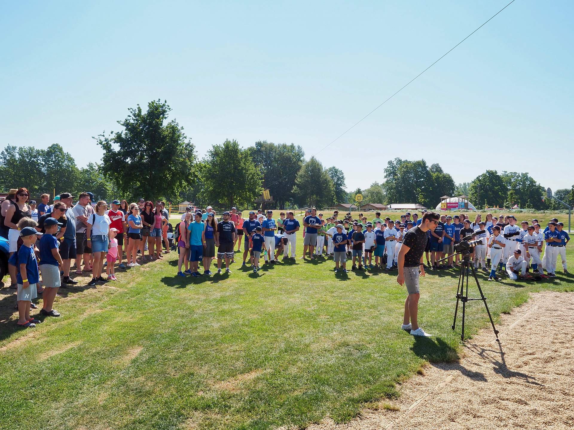 Hlavní program oslav pak začal v sobotu slavnostním zahájením u našeho dřevěného hradu. Slova se ujal předseda klubu David Šťastný, který na své pódiové hradby pozval všechny zakládající členy, kteří se účastnili oslav a vzpomenul na rané začátky hlubockého baseballu. Svůj prostor k proslovu poté převzal Michal Pirgl, hlavní trenér kategorie U7 a člověk, který také stál při zrodu a poděkoval Davidovi, za jeho skvěle odvedenou práci. V rámci slavnostního zahájení byly také odhaleny nové historické panely z let 2014-2018. Po všem povídání následovalo rozdání výročních triček a skupinové focení před hradem.