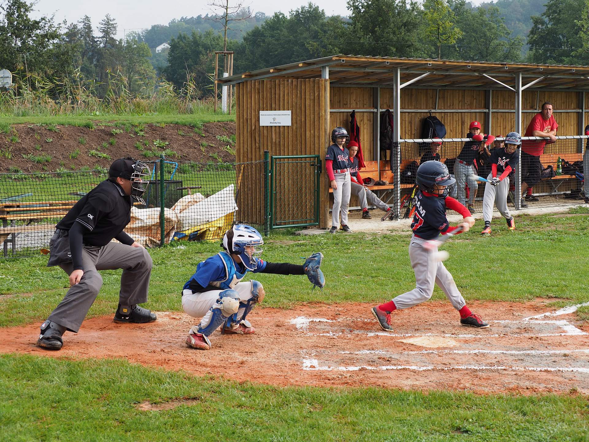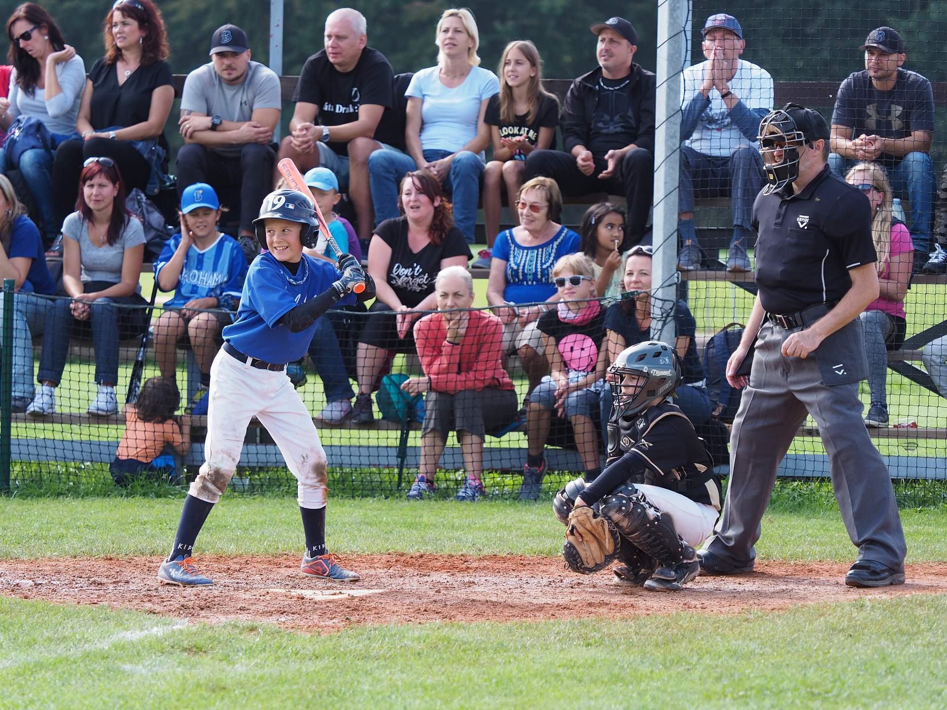 Druhým a posledním soupeřem hracího dne pro nás byl tým Draků Brno. Je to tým, jehož skalp nám do sbírky chybí jako poslední. Na nadhozu parádně začal Dan Bártů a se skvělou obranou v zádech udržel Draky pěkně na uzdě. Nám se podařilo proběhnout polem dvakrát a tak se Hluboká dostala do vedení. Ve druhé směně jsme přidali ještě další dva body, ale Draci se nenechali dál utlačovat a nasázeli nám rovnou osm bodů a dostali se do trháku. Tribuna praskala pod dusotem fanoušků, ze střídaček duněl řev týmů jako hnací motor pro své hráče a skóre se po třetí směně zastavilo na 9:8 pro Hlubokou. Domácí tým si totiž těch osm bodů nenechal líbit a vzápětí nasypal soupeřovi pět bodů a pak ho za pomoci nadhazujícího Matyho Kubátů nepustil do hry. Ve čtvrté směně byly oba týmy hodně opatrný a semkly se v obraně, protože tady šlo už o hodně. Ani jeden tým si tak nepřipsal bod. Podle časového limitu nás čekala poslední směna a nervozita na pálce nám nedovolila se protlačit polem a tak jsme nedali žádný bod. Na nadhozu se ve skvělém výkonu ukázala naše princezna Barča Klangů a vůbec to Drakům neulehčovala. Než jsme ale stihli nadělit soupeřovi tři outy, tak se jeden Drak utrhl a vyrovnal stav na 9:9. Zápas tedy musel pokračovat v tiebreaku. Nám se podařilo dvakrát pokořit domácí metu a teď už chyběla pouze dohrávka soupeře. Myslím, že tribuna už v tu chvíli nestála, ale zřítila se k zemi. Drakům se ale v rychlém sledu podařily dát tři body a tím zápas otočit v jejich prospěch a vyhrát 12:11. Byla to škoda, ale zážitek, atmosféra a výkon dětí, který jde jen těžko popsat.