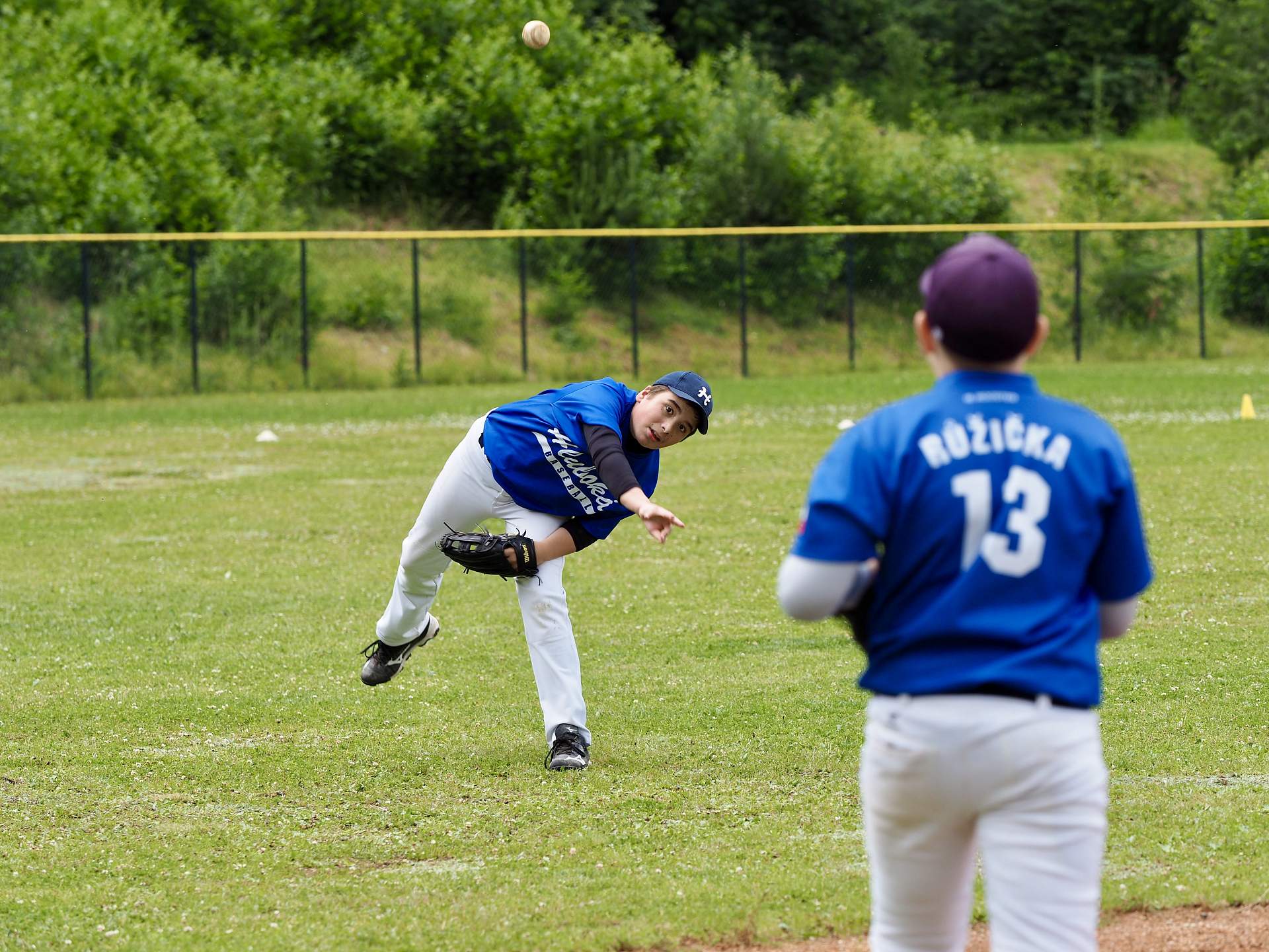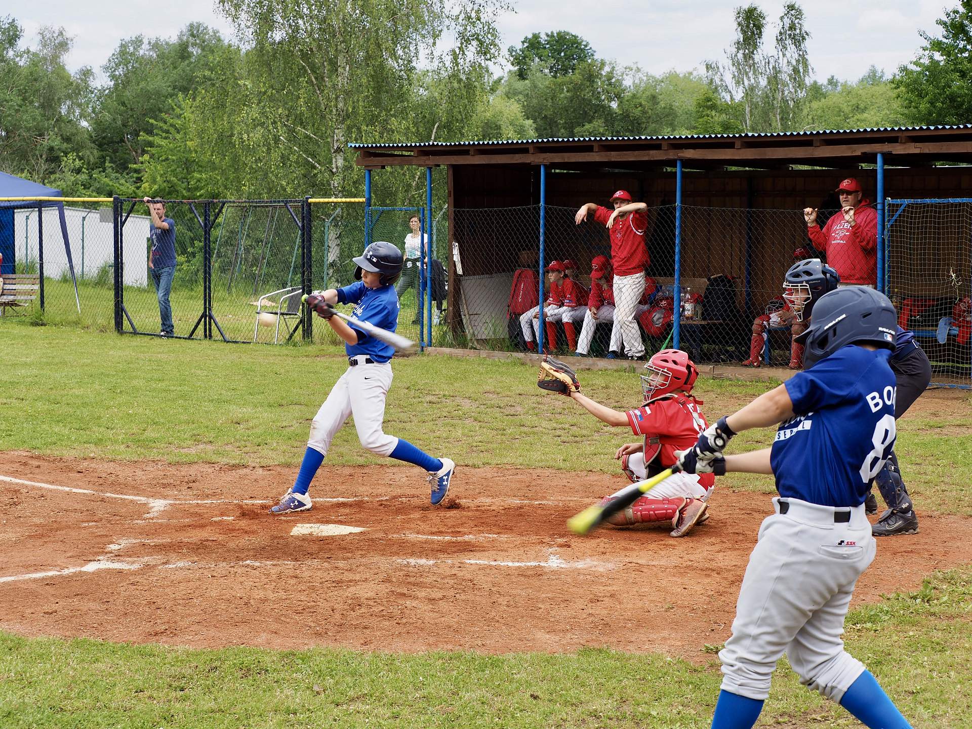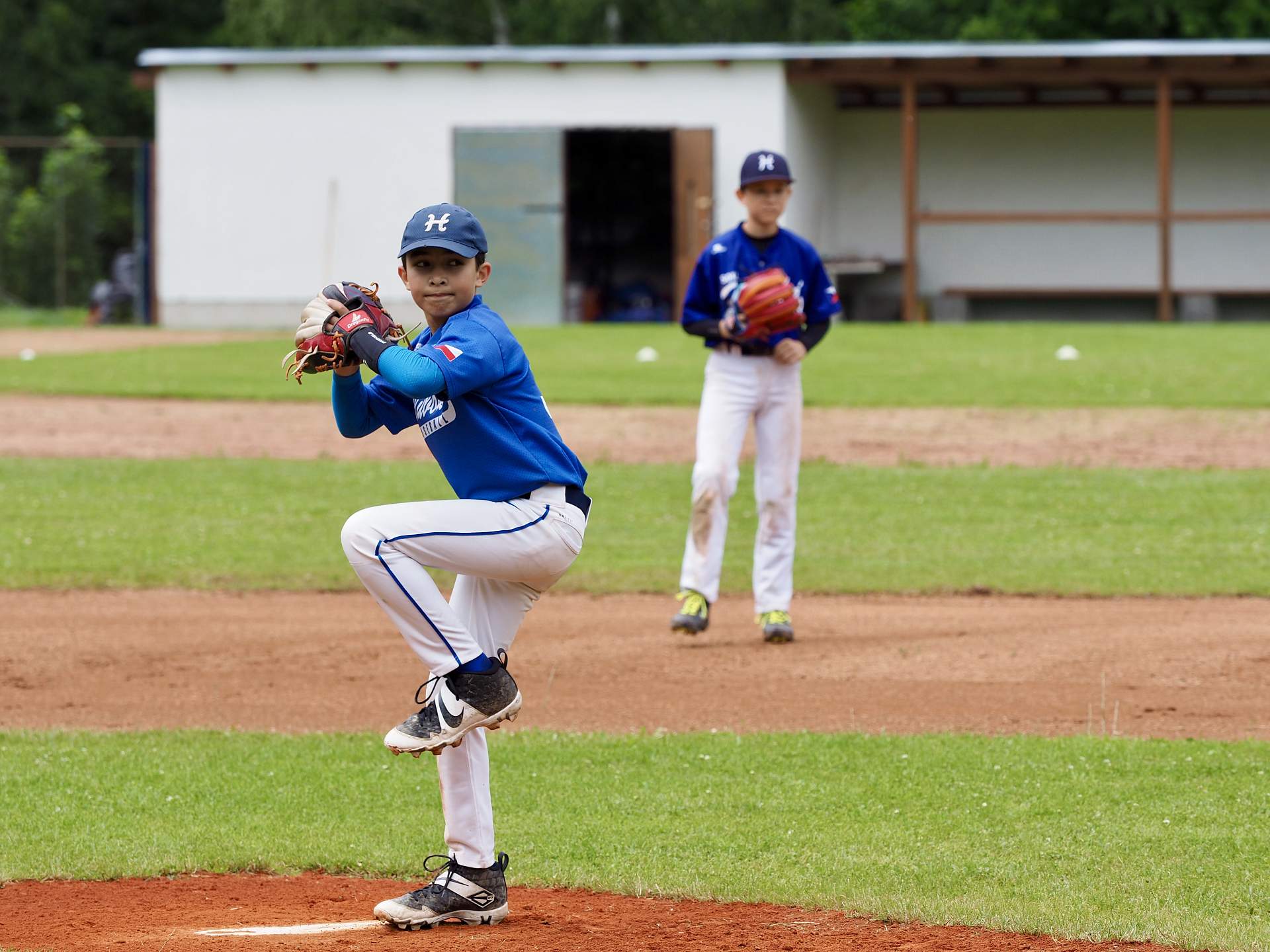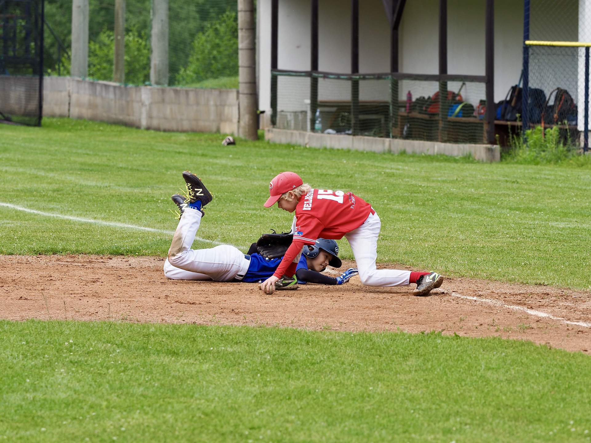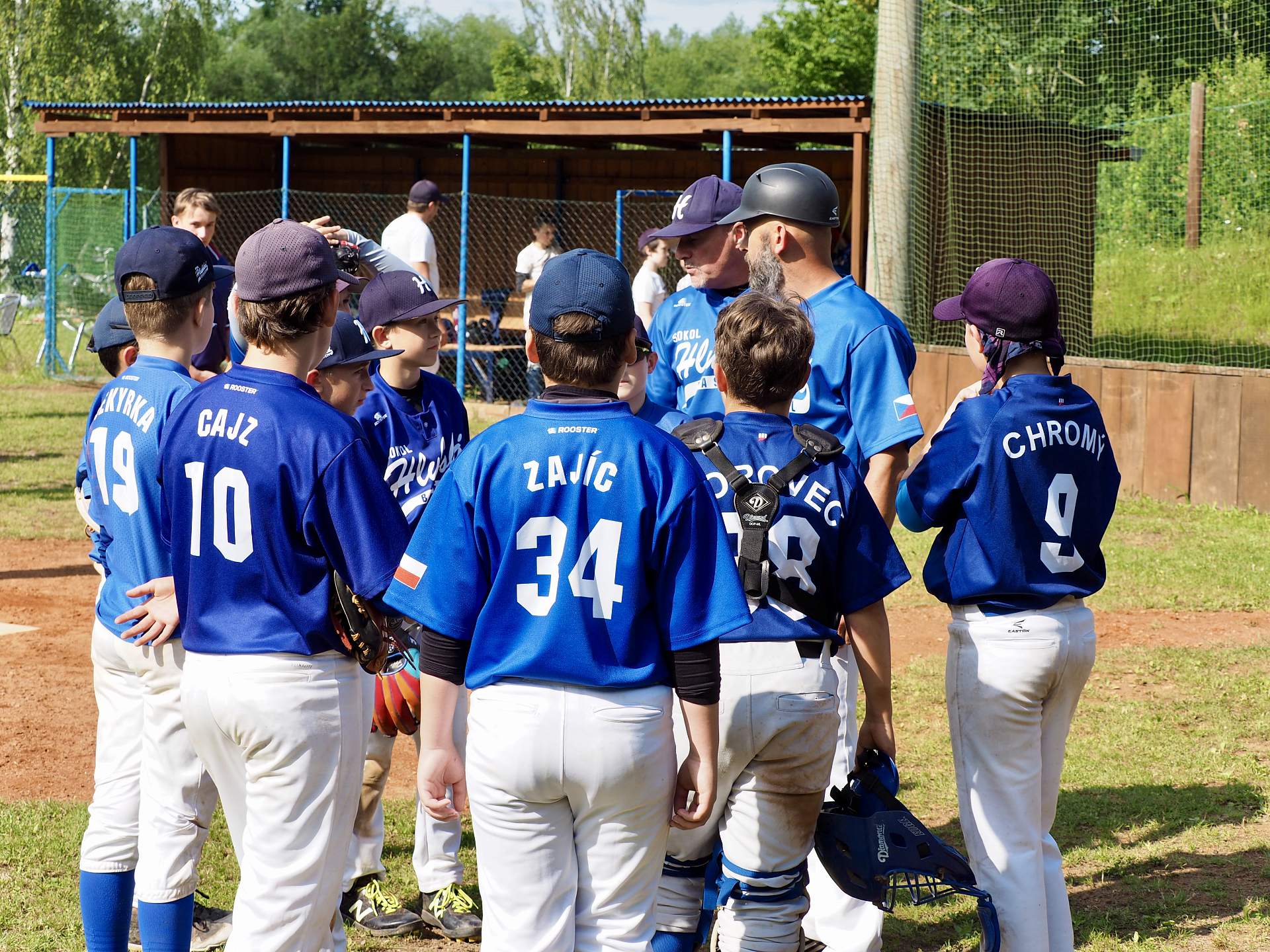 Oproti tomu zápas s Wolfs byl plný baseballu, nervů a infarktových záležitostí. Proti nám nastoupil Jan Hojda a házel výborně. My na začátek jsme nasadili na nadhoz borce, kteří hráli ještě loni U11. Bylo vidět že jejich premiéry na kopci byly nervozní a vzdálenost je pro ně ještě nenatrénovaná. Jako trenér jsem nechtěl kluky nějak trápit a raději přistoupil na formát 3 BB a vystřídat. Ještě máme hodně času natrénovat do turnajů na podzim. Nicméně nám to ukázalo, kde je trochu rezerva našeho týmu a kde pracovat. Jako třetí nadhazovač ale pod tlakem nastoupil do zápasu Lukáš Chromý. Stav zápasu totiž po první směně 5:5. Ve druhé naskočil již zmíněný Luky a to za stavu 5: 8 pro Domažky. Následovalo hodně errorů z naší strany. A Domažlice zvyšovali tlak a body. Pro Lukáše to byla těžká zkouška, ale věřili jsme že to ustojí. Bylo dobře že jsme ho nechali házet do doby co to šlo. Pouze těžké momenty a tlak soupeře posune hráče dál. Nicméně se Luky vyházel a odcházel v posledním inningu dolů za stavu 10:13 pro Wolfs. Náš closer byla skvělá volba, neboť Matěj Kubát se svou poker face nepustil ani jeden doběh. Ufff. Zbývala jen naše dohrávka. Během change teams na fieldu proběhla krátká porada, při které bylo vidět že kluci nejsou v žádném stresu a užívali si napínavý zápas. Věřili jsme, že s naší formou jsme schopni otočit zápas. Jejich nový nadhazovač házel pomaleji a to nám pomohlo – kromě Míši Cajze ten totiž dostal při plných metách intentional walk :-( Bod doma. Ty poslední tři body krásným ground ballem po lajně až k plotu na pozici 7 stáhl Luky Chromý a a sám zůstal na 2B. Radost veliká co Vám budu povídat. Vítězství 14:13 bylo vydřené, ale zasloužené.