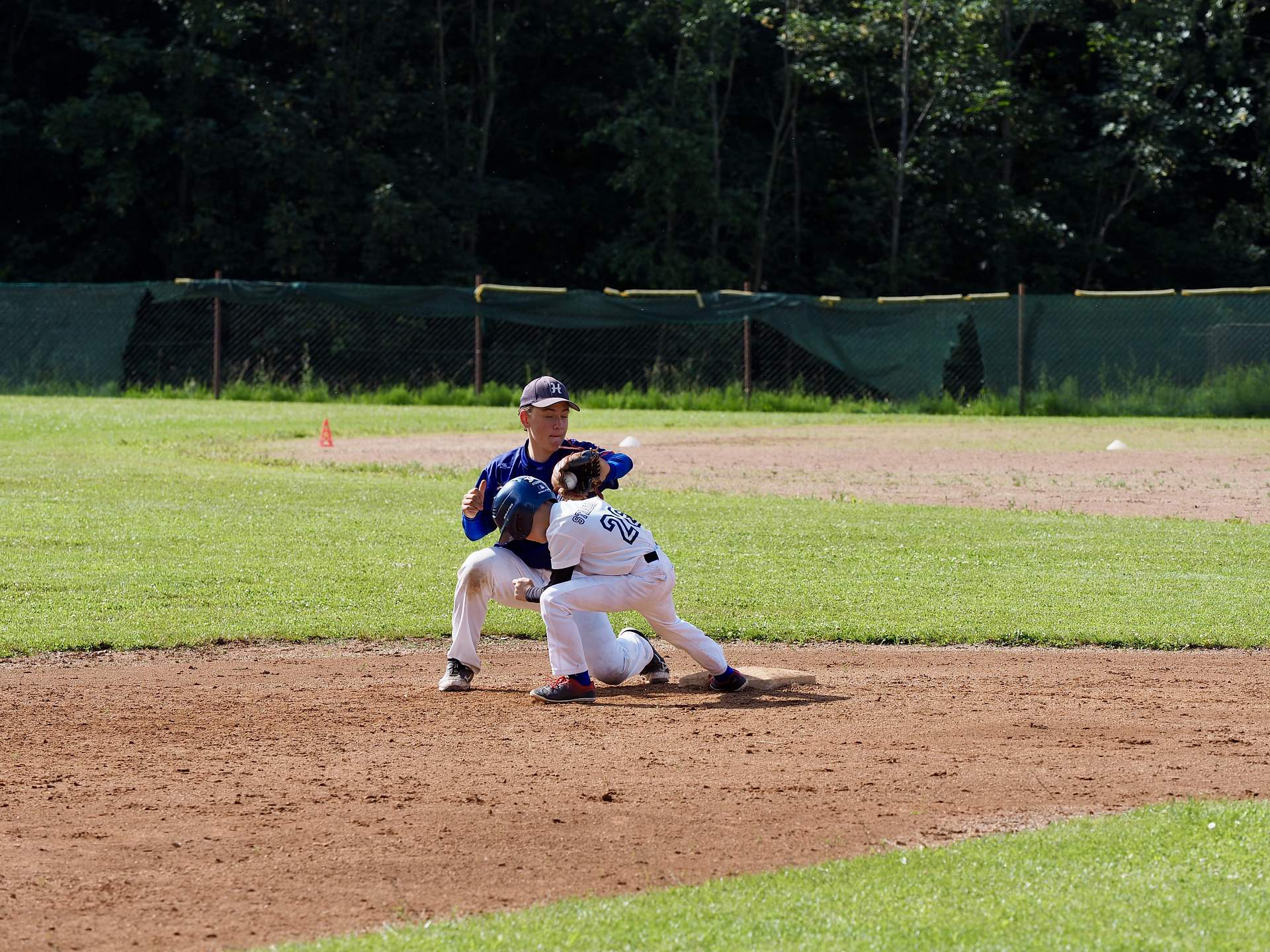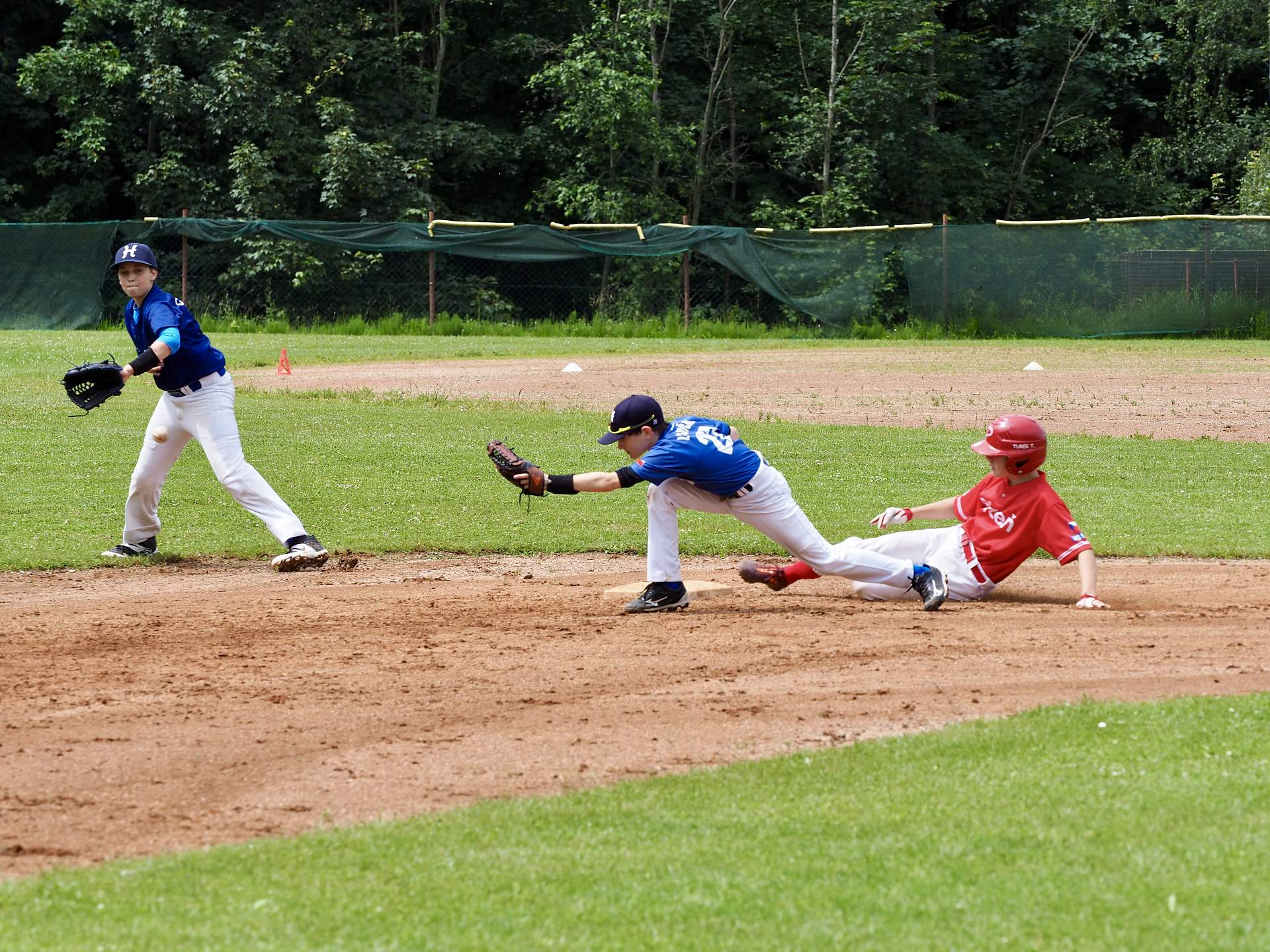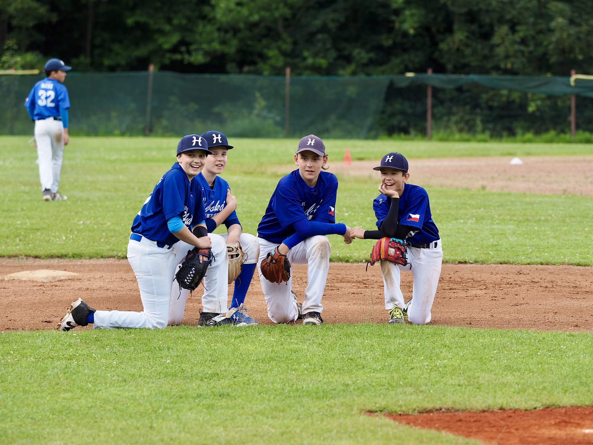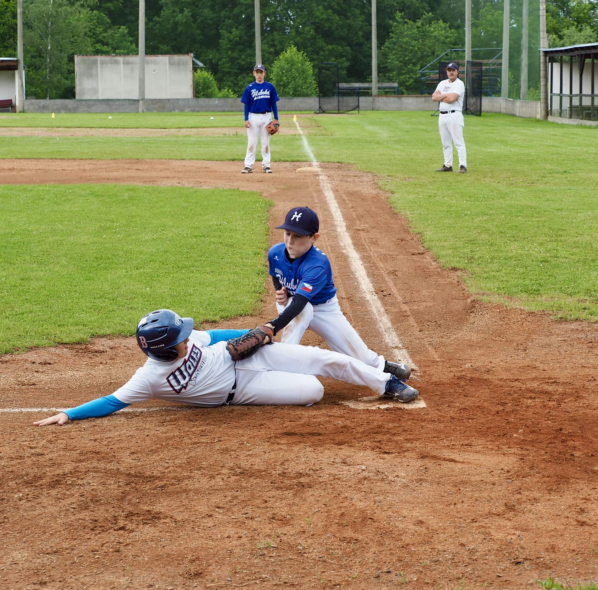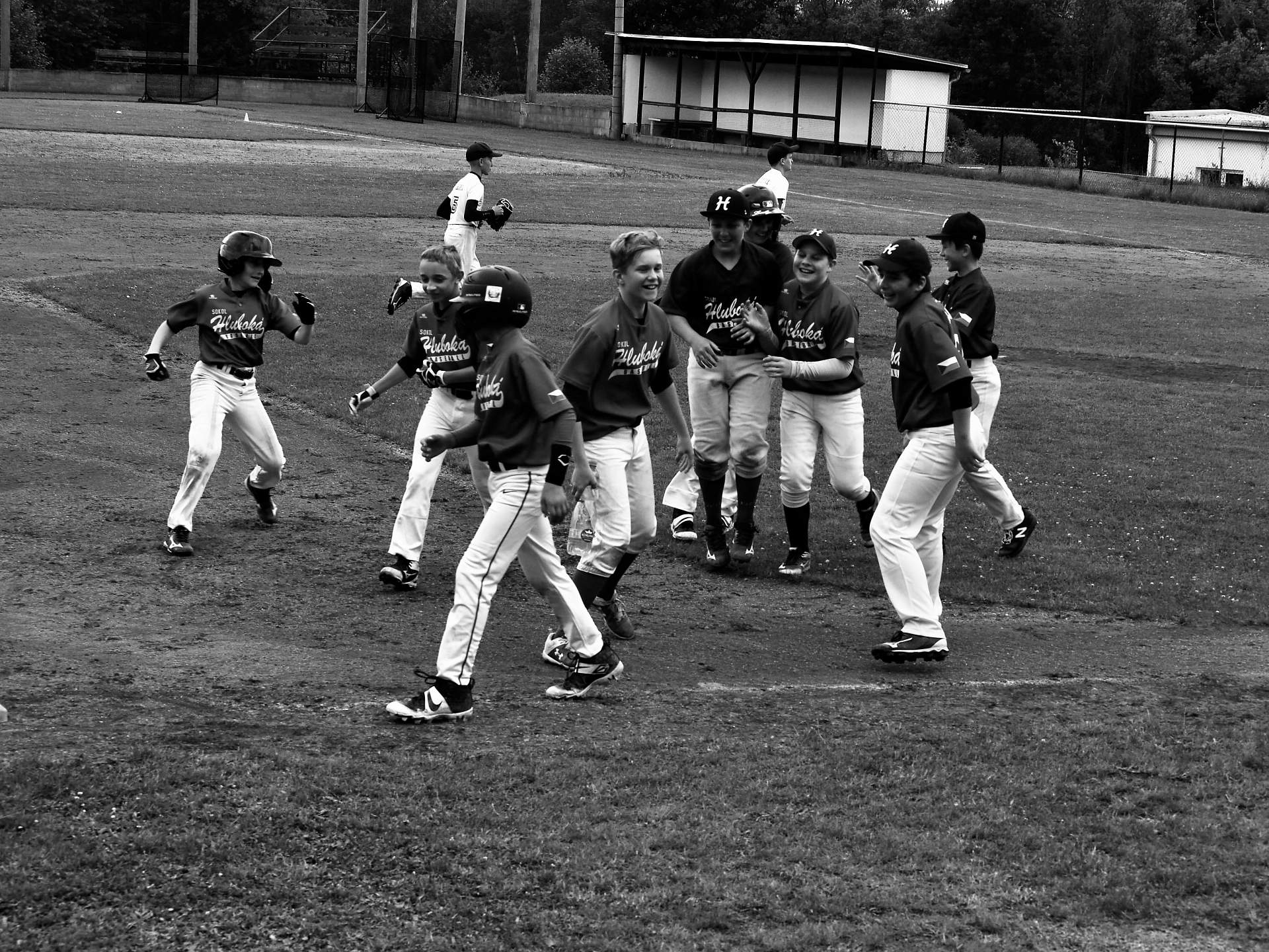 Oproti tomu zápas s Wolfs byl plný baseballu, nervů a infarktových záležitostí. Proti nám nastoupil Jan Hojda a házel výborně. My na začátek jsme nasadili na nadhoz borce, kteří hráli ještě loni U11. Bylo vidět že jejich premiéry na kopci byly nervozní a vzdálenost je pro ně ještě nenatrénovaná. Jako trenér jsem nechtěl kluky nějak trápit a raději přistoupil na formát 3 BB a vystřídat. Ještě máme hodně času natrénovat do turnajů na podzim. Nicméně nám to ukázalo, kde je trochu rezerva našeho týmu a kde pracovat. Jako třetí nadhazovač ale pod tlakem nastoupil do zápasu Lukáš Chromý. Stav zápasu totiž po první směně 5:5. Ve druhé naskočil již zmíněný Luky a to za stavu 5: 8 pro Domažky. Následovalo hodně errorů z naší strany. A Domažlice zvyšovali tlak a body. Pro Lukáše to byla těžká zkouška, ale věřili jsme že to ustojí. Bylo dobře že jsme ho nechali házet do doby co to šlo. Pouze těžké momenty a tlak soupeře posune hráče dál. Nicméně se Luky vyházel a odcházel v posledním inningu dolů za stavu 10:13 pro Wolfs. Náš closer byla skvělá volba, neboť Matěj Kubát se svou poker face nepustil ani jeden doběh. Ufff. Zbývala jen naše dohrávka. Během change teams na fieldu proběhla krátká porada, při které bylo vidět že kluci nejsou v žádném stresu a užívali si napínavý zápas. Věřili jsme, že s naší formou jsme schopni otočit zápas. Jejich nový nadhazovač házel pomaleji a to nám pomohlo – kromě Míši Cajze ten totiž dostal při plných metách intentional walk :-( Bod doma. Ty poslední tři body krásným ground ballem po lajně až k plotu na pozici 7 stáhl Luky Chromý a a sám zůstal na 2B. Radost veliká co Vám budu povídat. Vítězství 14:13 bylo vydřené, ale zasloužené.
