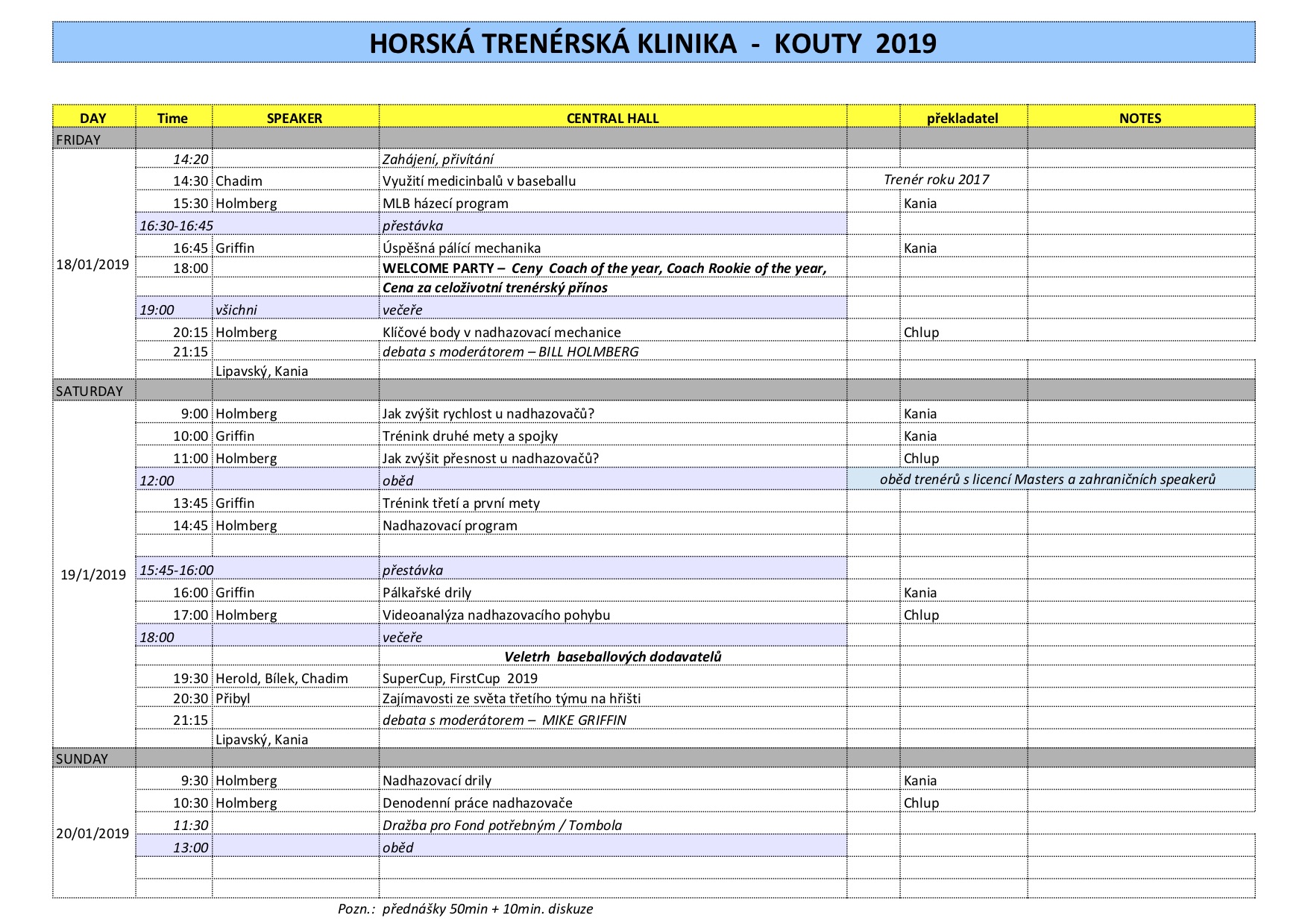 18. 1. – 20. 1. 2019 proběhne v Koutech nad Desnou pod Červenohorským sedlem již 19. ročník Horské kliniky. Největším tahákem budou speakři Bill Holmberg (MLB coach Italské baseballové akademie a pitching coach italského národního týmu) a Mike Griffin (trenér americké akademie Pro5 v Severní Karolíně a českého seniorského národního týmu). Životopis obou choachů najdete zde.